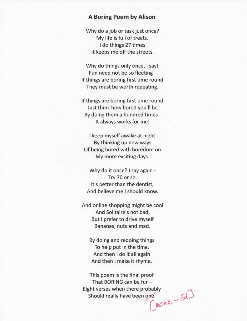 Love the First or The Hunting of the Snog Bit the First My name is not Carol though nonsense I write In a rhythm you might recognise, But as my First Romance I describe with delight Permit me to plagiarise. Bit the Second An innocent schoolgirl with dreams by the score (As in all the best Mills & Boon plots), I acquired a suspicion that schoolboys were more Than just gum-chewing horrors with spots. Bit the Third So picture the scene: I was young, I was green, With a gymslip conveniently matching, And a sporty young chap I did set out to trap By the means of a plan I was hatching. Bit the Fourth With his timetable handy my ways were discreet - I arranged to be always around. Nine times every day on the stairs we would meet And I'd drop all my books on the ground. Bit the Fifth In despair and defeat I would faint at his feet, But silent and strong he would stand. That could only imply that my hero was shy So a party I schemingly planned. Bit the Sixth With problems like parents and light bulbs removed, By my hero the bottle was spun - By some strange strategy it was pointing at me And we showed them all how it was done! Bit the Seventh Though so shy and so young, in a thick Mersey tongue He would say the occasional word. I go weak at the knees when I think of that squeeze - He's a sports teacher now I have heard. Bit the Eighth This romantic intrigue you may read with fatigue But to me it was better than Latin. There’s only one track that will bring it all back - Moody Blues singing “Nights in White Satin.” Alison Humphries 1984