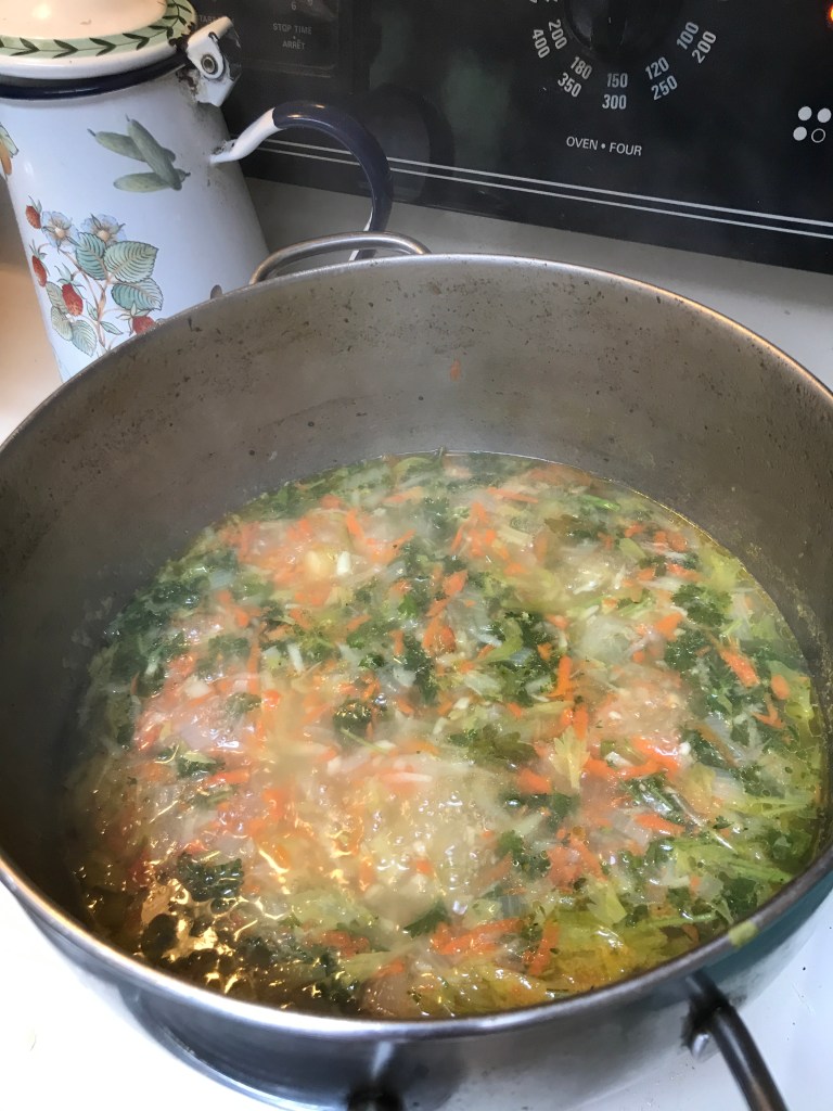 If you’re wondering what “soup celery” is, it’s red celery and the leaves were as important as its thin stalks. Good luck with finding any colour of celery leaves. Here on Gabriola I asked where the leaves of the naked-looking celery had got to and was told they cut them off. And they don’t even give them to the pigs, or to their local impoverished writers. They throw them away! I’m thinking of a little local skip diving here once the shock wears off and the weather picks up.