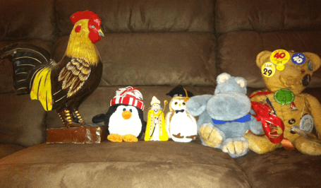 The Animals Went In One By One. L-R: papier-mâché cockerel, black and white stuffed creature with orange nose and red-and-white hat (species undetermined), wise man, owl, hippopotamus, teddy bear (Bruin).